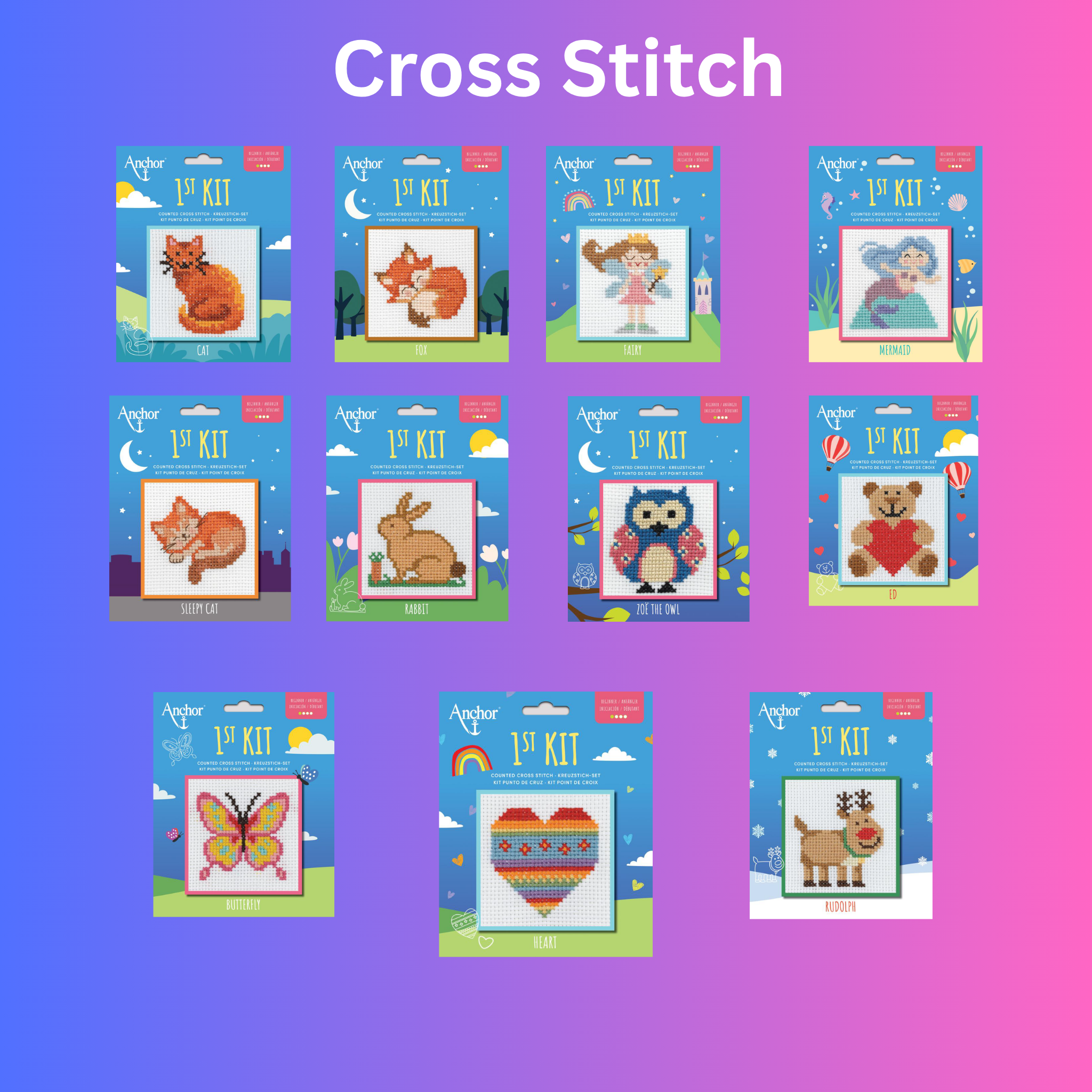 11 designs to choose from. Kit contains: Anchor Stranded Cotton Metal Tapestry Needle Aida 8 count (15 x 15cm) Chart and Instructions Finished size 10x10cm * Suitable for children 6 years of age and above. Contains a rounded tapestry needle. To be used under the direct supervision of an adult.