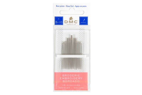 A pack of 16 DMC embroidery needles in sizes 1-5. With a pointed end, these embroidery needles will easily stitch most fabrics and can be used with DMC embroidery threads: Stranded Cotton, Pearl Cotton, and Coton à Broder.