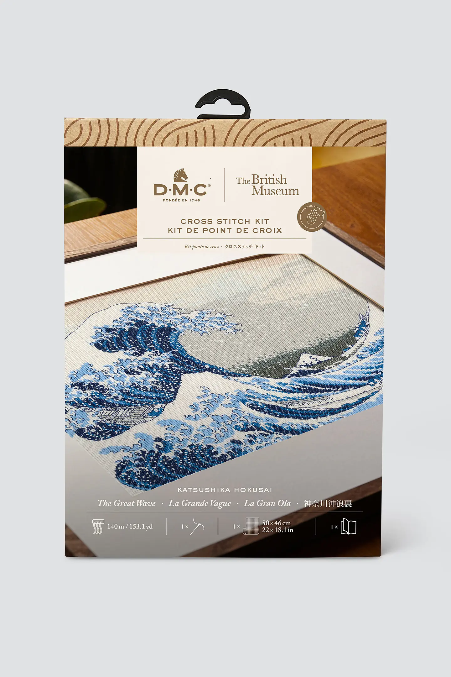 PRE-ORDER (Despatch within 7 working days) Transforming this iconic woodblock print into cross stitch will allow you to experience the artwork in a new way, adding texture with Mouliné Spécial threads. Size – 50x46cm / 22×18.1″ One kit: 14 count Aida DMC Threads on organiser Needle Chart and Instructions
