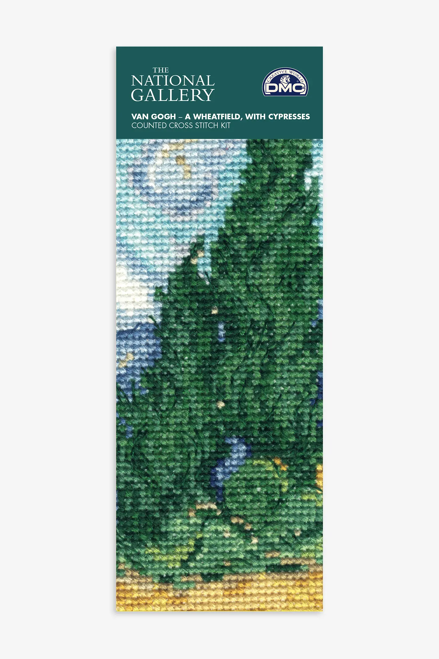 Cross stitch bookmark kit of Van Gogh’s “”Wheatfield with Cypresses””. The famous painting of a field and cypress trees was done by Vincent Van Gogh in 1889. This delightful mini tableau can be created using our DMC stranded cotton.