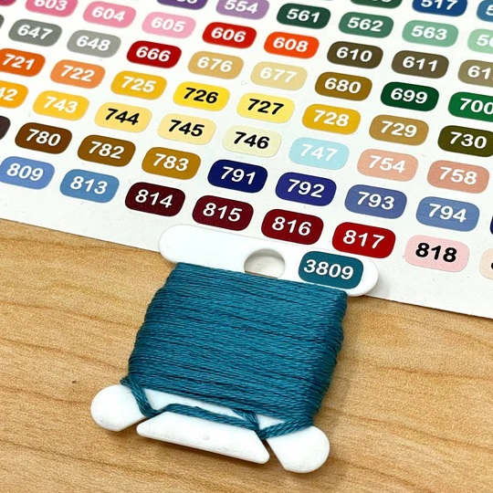A set of small colour labels for the complete set of DMC. They are the perfect size to fit on standard thin bobbins which have the hole in the top (DMC and other brands) .