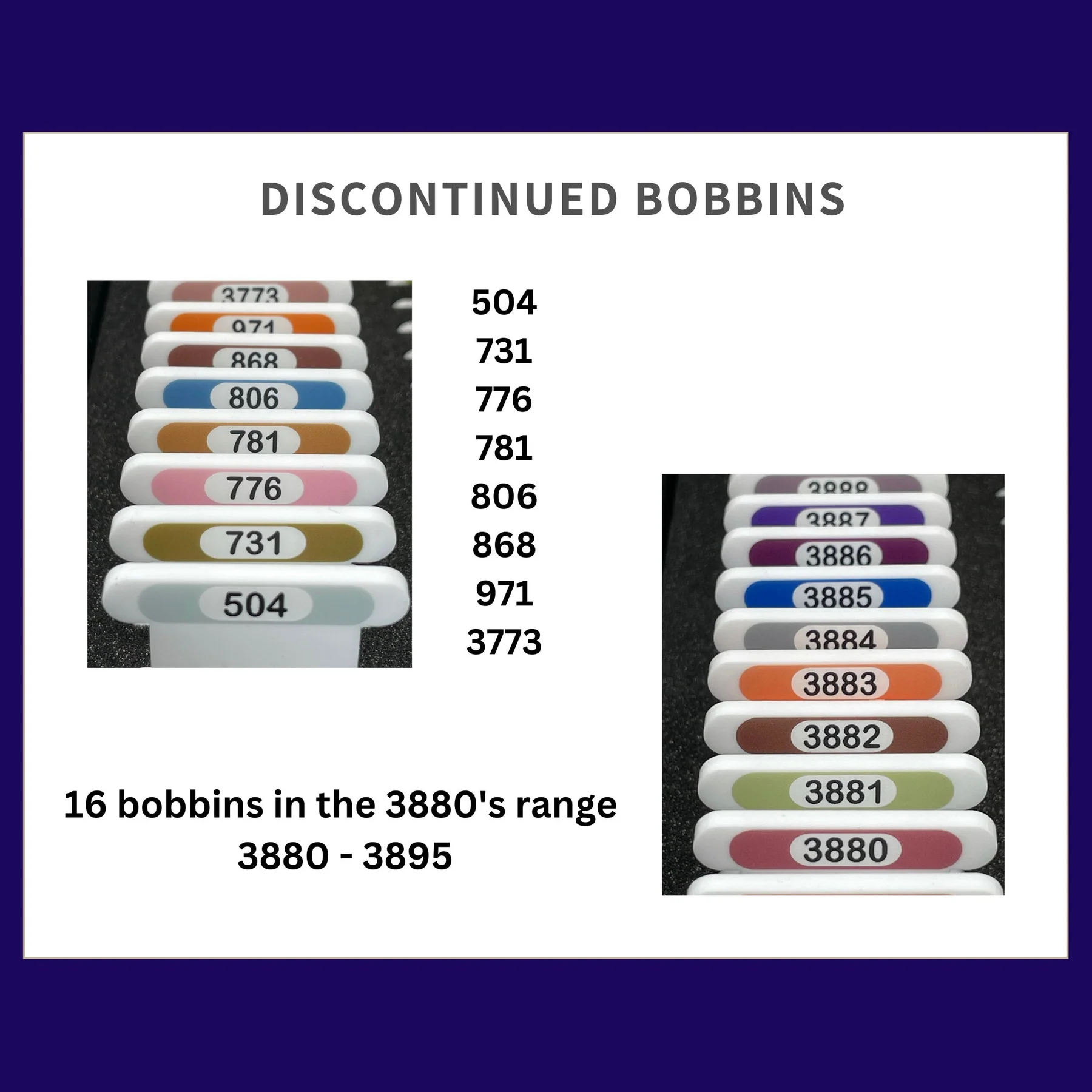 The x24 discontinued numbers included are: 504, 731, 776, 781, 806, 868, 971, 3773 and 16 bobbins between 3880 – 3895