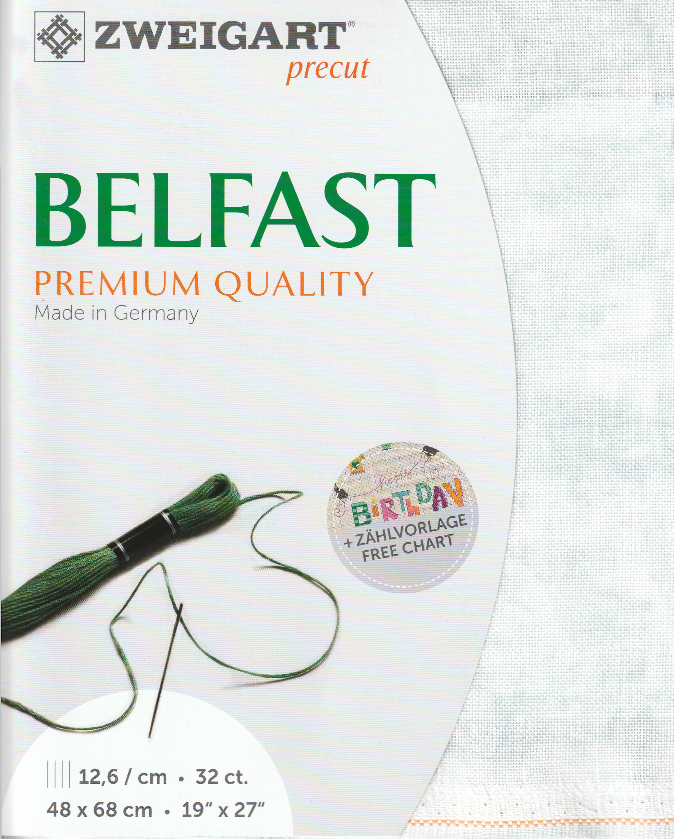 Genuine Zweigart Belfast 32 count canvas, 0.48 metres wide & 0.68 metres long. Ideal for counted thread and cross stitch embroidery projects. Belfast linen is equivalent to 16 count when worked over two threads and at the same time offers the stitcher a more even surface. 100% linen; 48x68cm (19×27″)